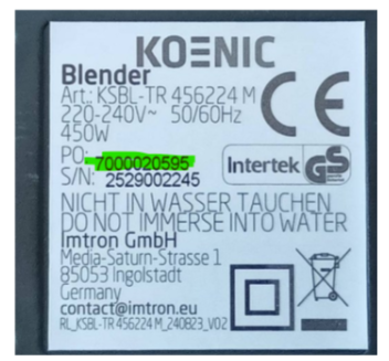 Die PO Nummer finden Sie auf dem Typenschild auf der rechten Seite oder der Verpackung des Geräts.